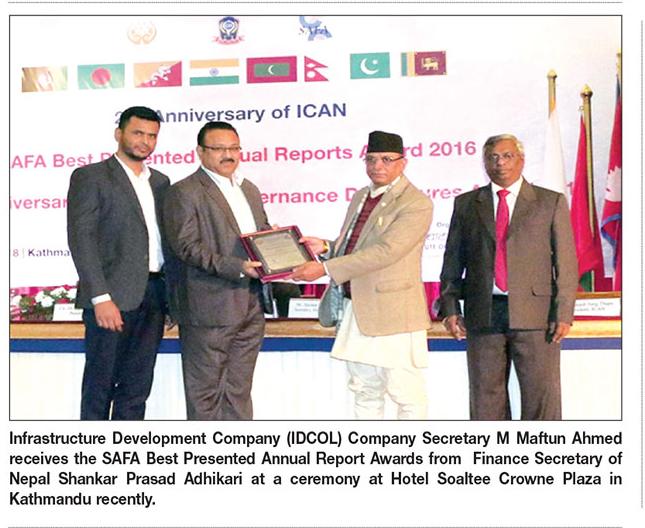 Infrastructure Development Company Limited (IDCOL), a government owned financial institute, has been awarded with the SAFA Best Presented Annual Report Awards and SAARC Anniversary Awards for Corporate Governance Disclosures-2016 under Public Sector Entities category. Mr. M Maftun Ahmed, Company Secretary, IDCOL and Mr. M Mizanur Rahman, Unit Head, Finance & Accounts, IDCOL received the award from Nepal’s Finance Secretary Shankar Prasad Adhikari and SAFA President Dr Suvod Kumar Karn at an awarding ceremony at Hotel Soaltee Crowne Plaza in Kathmandu on 31 January 2018. IDCOL won the award in the South Asia outshining counterparts in India, Sri Lanka, Pakistan, Nepal, the Maldives, Bhutan and Afghanistan. This award has been conferred on IDCOL on the basis of evaluation administered by SAFA's Committee for Implementation in Transparency, Accountability and Governance.