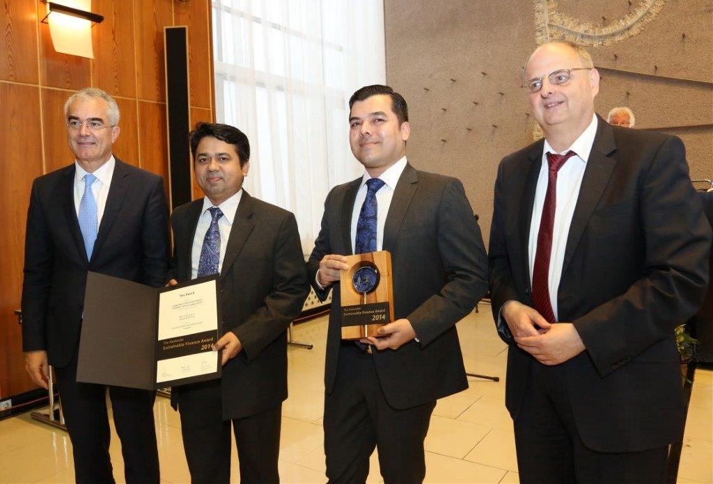 IDCOL wins the Karlsruhe Sustainable Finance Award 2014 in the category of 'Best Innovation in Sustainable Products and Services' for successful dissemination of solar home systems (SHS) in Bangladesh. IDCOL has been honored for its efforts in applying innovative approaches to promote a low carbon and sustainable economy. Mr. Enamul Karim Pavel, Head of Renewable Energy, IDCOL and Mr. Nazmul Haque, Director (Investment) & Head of Advisory, IDCOL have received the award in a prestigious ceremony that took place in the City Hall, Karlsruhe, Germany on 12 June 2014. Till May 2014, more than 3.1 million solar home systems have been installed under IDCOL SHS program, providing clean energy solution to about 14 million off-grid rural people of Bangladesh. The Program has contributed towards creation of more than 70,000 jobs, power generation of 140MW, development of local support industries and annual CO2 emission reduction of more than 538,000 tons.